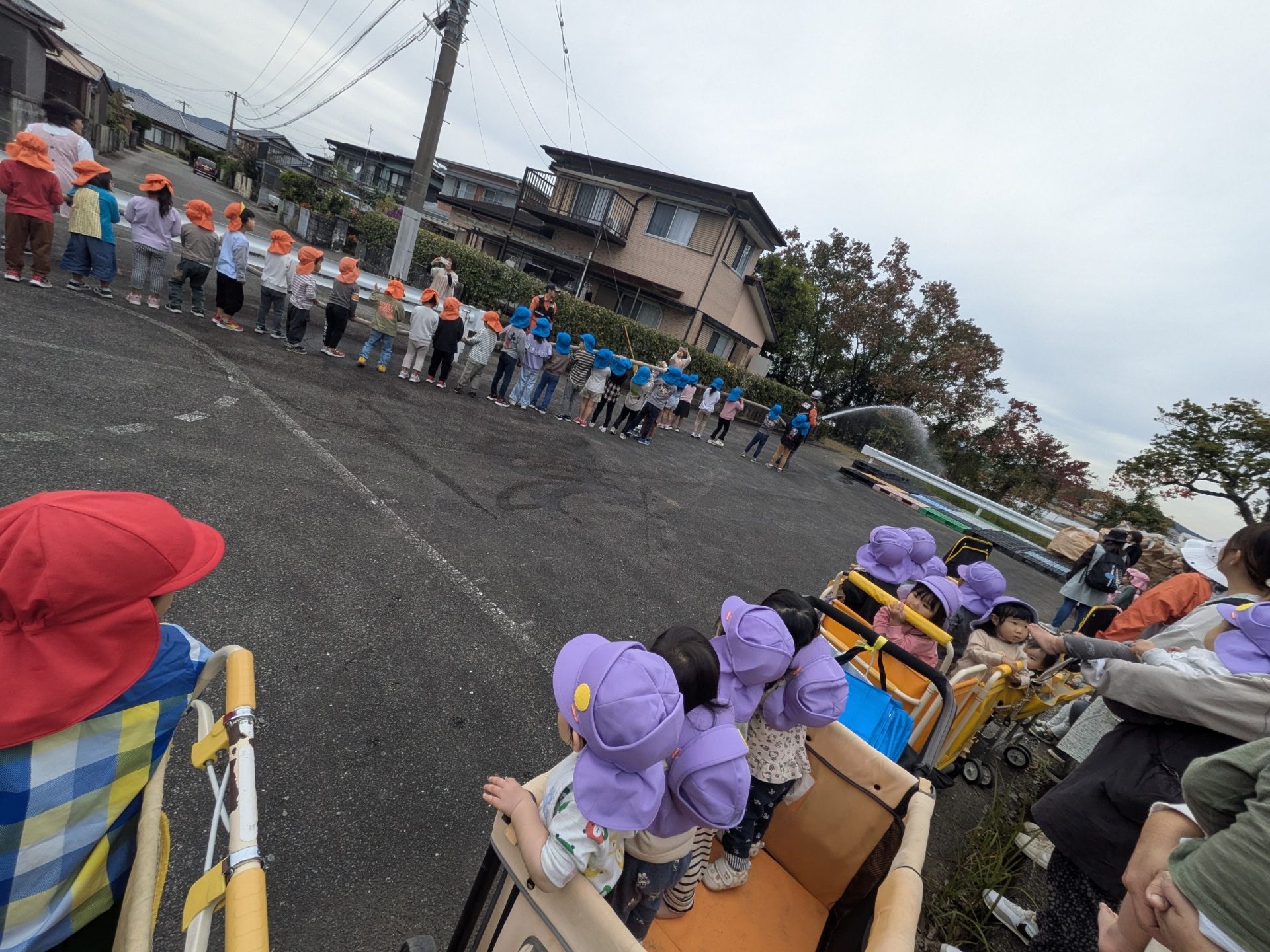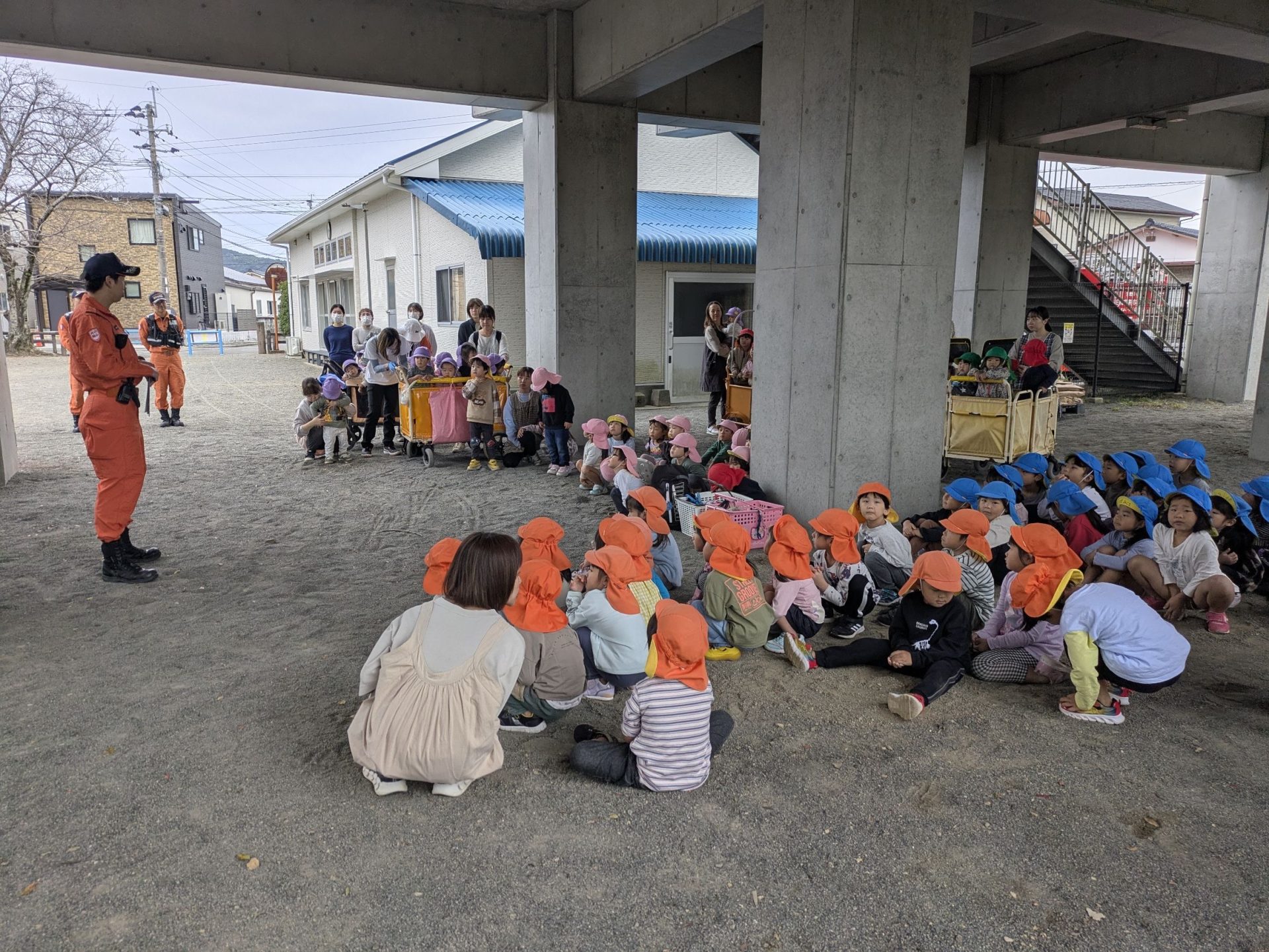 子ども達は落ち着いて、避難タワーまで上手に避難できました。 消防士さんのアドバイスを真剣な眼差しで聞き入ってましたよ。