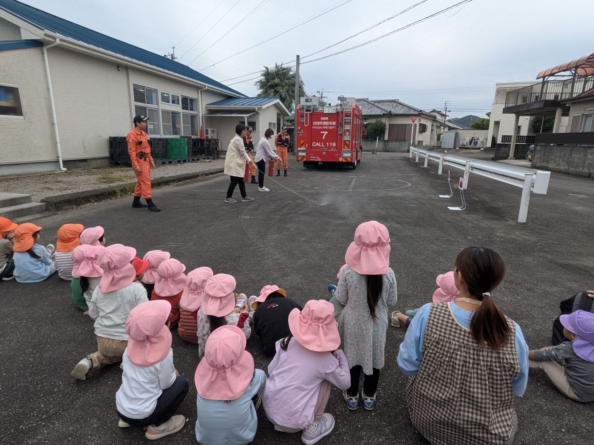 放水も経験させていただき大喜びの子どもたち☺ 消火訓練も無事に終了し、楽しみにしていた消防車の見学です。
